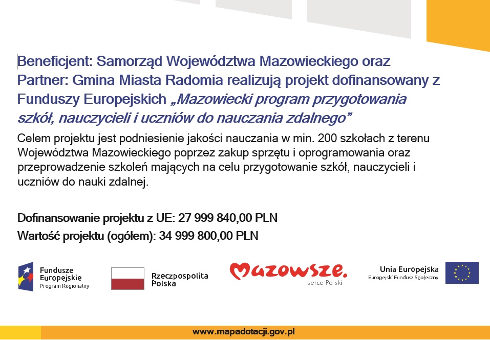 Gmina Miasta Radomia w partnerstwie z Samorządem Województwa Mazowieckiego realizuje projekt pn. „Mazowiecki program przygotowania szkół, nauczycieli i uczniów do nauczania zdalnego” w ramach X Osi priorytetowej „Edukacja dla rozwoju regionu”, Działania 10.1 „Kształcenie i rozwój dzieci i młodzieży”, Poddziałania 10.1.1 „Edukacja ogólna”, którego celem jest podniesienie jakości nauczania w min. 200 szkołach z terenu Województwa Mazowieckiego poprzez zakup sprzętu i oprogramowania oraz przeprowadzenie szkoleń mających na celu przygotowanie szkół, nauczycieli i uczniów do nauki zdalnej. W ramach projektu Publiczna Szkoła Podstawowa Nr 14 Integracyjna im. Jana Pawła II w Radomiu otrzyma pakiet sprzętu w postaci: zestawów komputerowych, laptopów, tabletów, drukarek, urządzenia wielofunkcyjnego, projektora multimedialnego, monitora interaktywnego oraz pakiet oprogramowań wspierających naukę zdalną. Ponadto wsparciem szkoleniowym w zakresie nauczania zdalnego objęci zostaną nauczyciele i uczniowie. Wartość projektu wynosi 34 999 800,00 zł, natomiast dofinansowanie ze środków Unii Europejskiej wynosi: 27 999 840,00 zł.